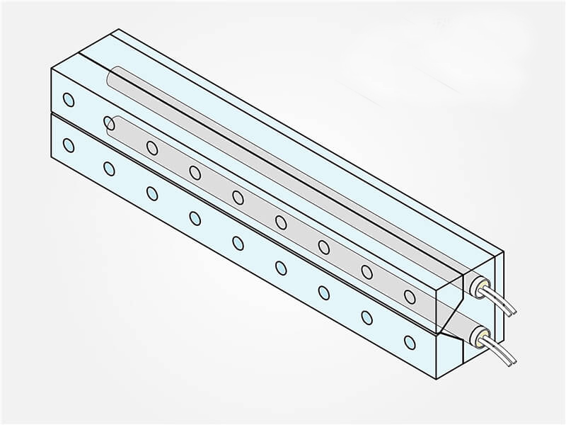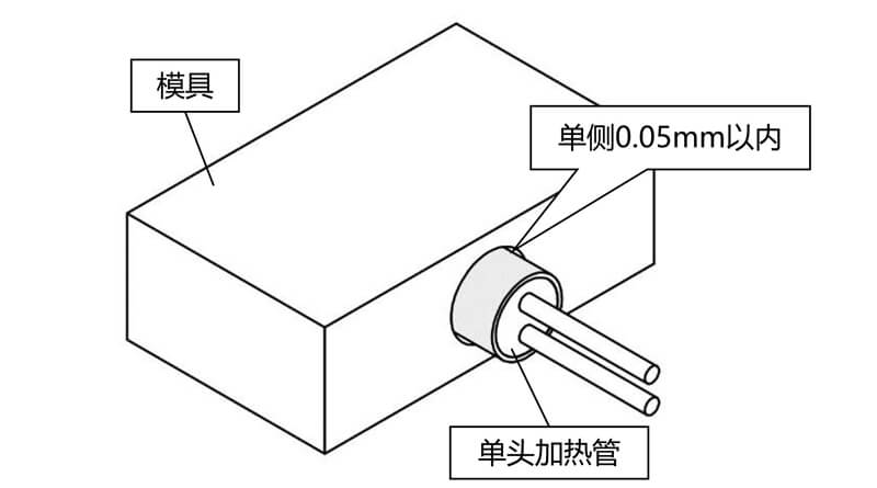 根據單頭加熱管的尺寸在模具上預留安裝孔(或根據安裝孔的尺寸定制加熱管的外徑),請盡量縮小加熱管與安裝孔的間隙,加工安裝孔時,單側間隙建議取0.05mm以內。