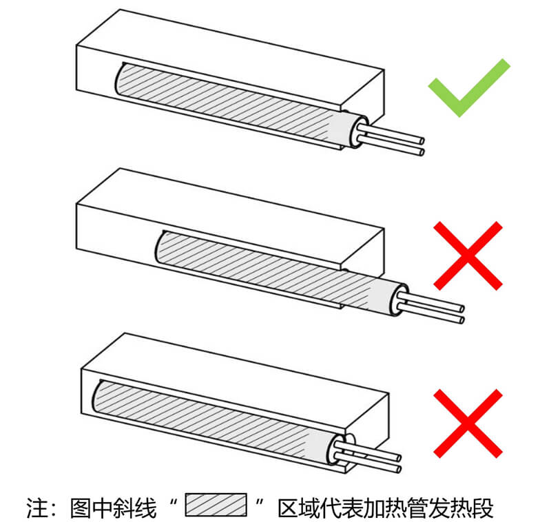 未固定的加熱管在模具孔中的容易來回移動,可能導致發熱區域暴露在空氣中或引線進入高溫區域,或將引起加熱管損壞、觸電、火災等事故發生。可選用頂絲或者固定片等方式將加熱管固定。
