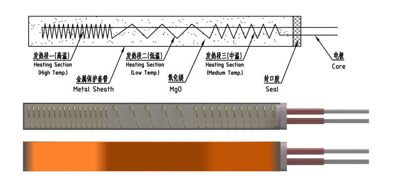 均熱型加熱管的發熱絲,兩端部的繞絲密度與中間是不同的,纏繞密度更高的兩端總體發熱量比中間大,但兩端散熱也比中間快,由此平衡后則得到了溫度均勻的發熱段。