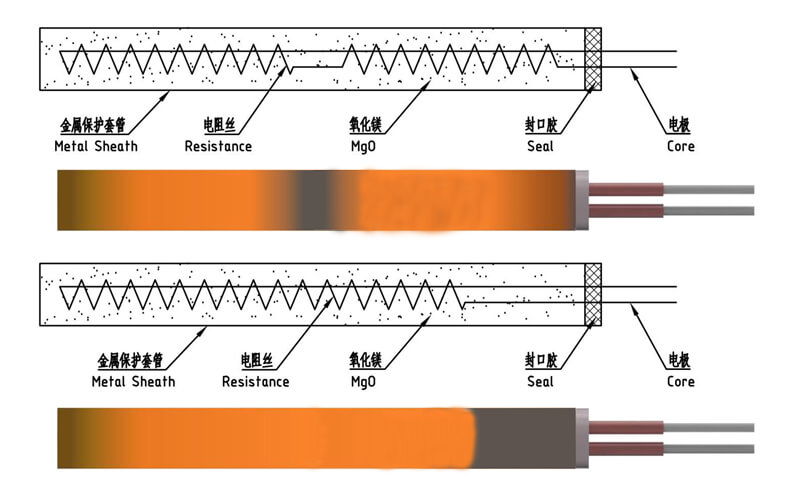 由上圖可以清晰看到外接線與內引線結構的不同,外接線結構是引出棒與引線在發熱管外部通過壓線端子接線,內引線結構是引線直接從發熱棒的內部接出。