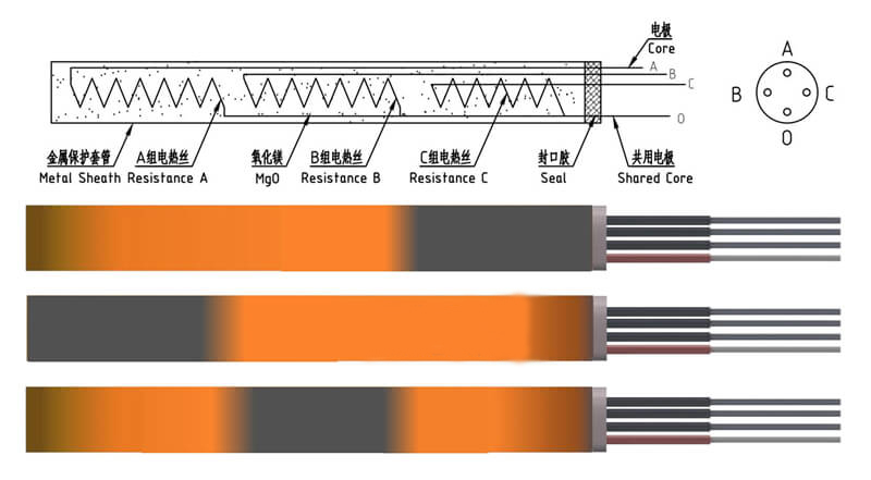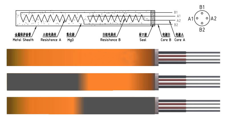 2組單獨控制型加熱管和共享電極型多組控制型加熱管,金屬平臺的加熱系統可大批量使用此類型的加熱管,根據加熱平板的溫度單獨控制對應的某一個加熱段,保證加熱平臺的溫度均勻性。