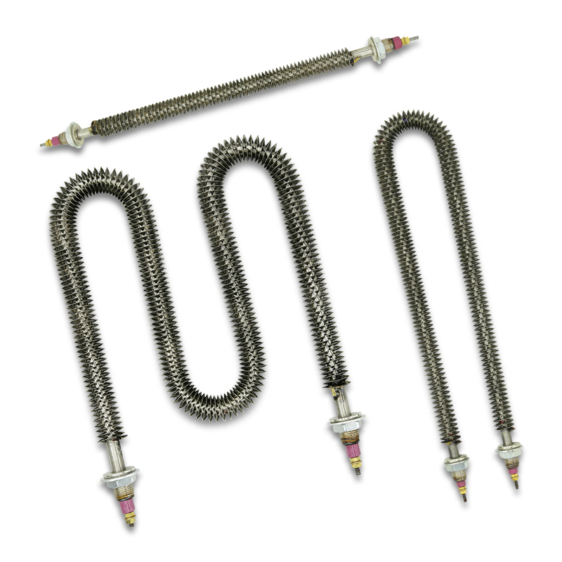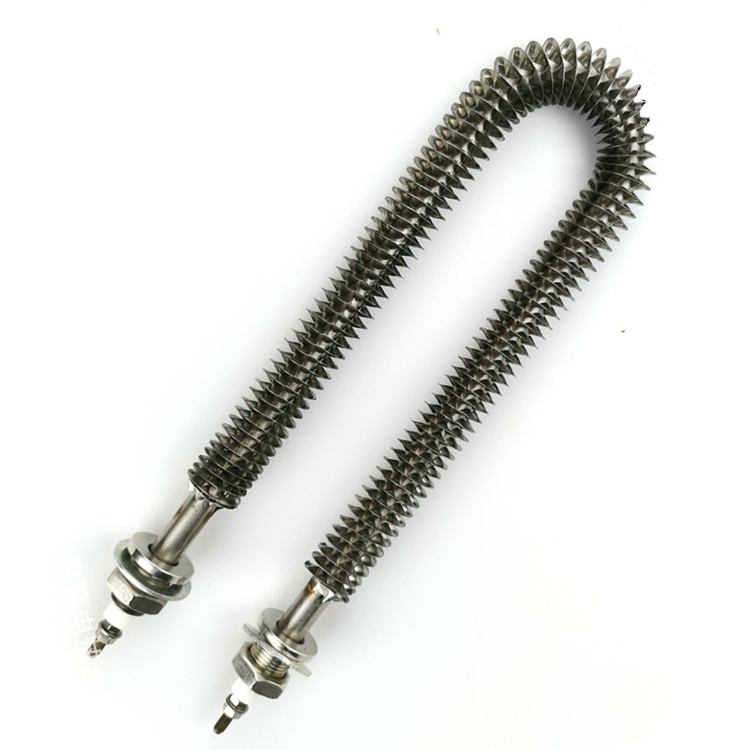 翅片式電加熱管,是在普通元件表面纏繞金屬散熱片,與普通元件相比散熱面積擴大了2~3倍,即翅片元件所允許的表面功率負荷是普通元件的3~4倍。由于元件的長度縮短,使得本身的熱損失減小,在相同的功率條件下具有升溫快、發熱均勻、散熱性能好、熱效率高、使用壽命長、加熱裝置體積小,成本低等優點。根據用戶要求進行了合理的設計,便于安裝。