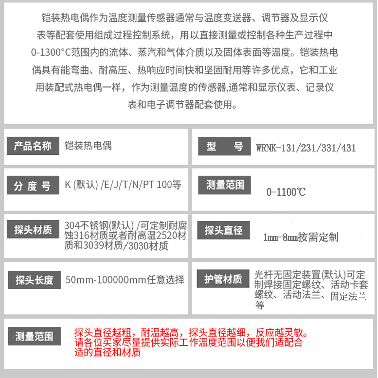 鎧裝熱電偶通常和顯示儀表、記錄儀表、電子計算機等配套使用。鎧裝熱電偶直接測量各種生產過程中的0°C~1300°C范圍內液體,蒸汽和氣體介質以及固體表面溫度。